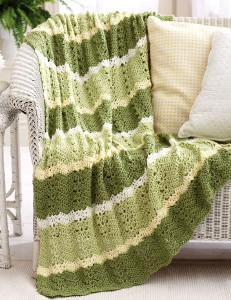 Journey to greener pastures with this crochet blanket pattern. The Green Meadows throw will rejuvenate whatever room it's in! If you're in need of some easy crochet patterns, then you're in luck. It only takes a few simple steps and stitches to complete this lovely crochet blanket pattern. Stripes of radiant spring greens create the perfect lacy design. You can almost smell the freshly cut grass with this throw in the room.