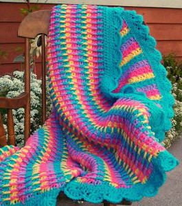 A combination of the half double crochet stitch and the triple stitch gives this crochet baby blanket pattern awesome interlocking, three dimensional dashes. Each side of this afghan has its own unique texture and adorable edging gives it a cute, finished look.
