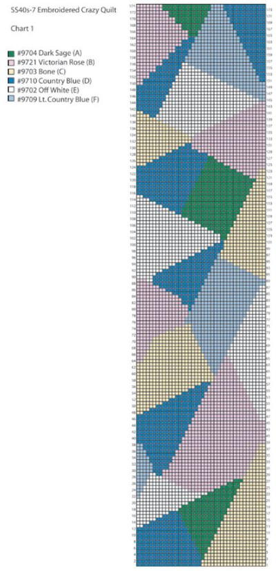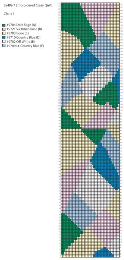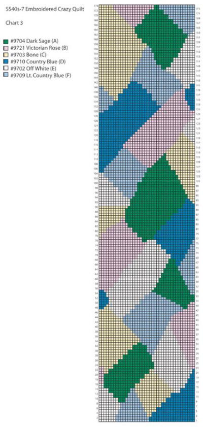 1) Starting chain for colors (on charts) for each panel is made by reading from left to right across Row 1 of charts. Then when Row 1 is worked, from right to left, you will be working on the right side of the panel. The next row will be Row 2. Do this on all the panels at the beginning.