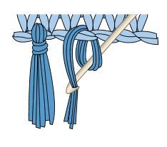 Cut lengths of yarn approx 18” [45.5 cm] long. Taking 2 strands tog, fold strands in half and knot into fringe, matching 3-strand weaving group ends at top and bottom edges of Blanket. Trim fringe evenly.