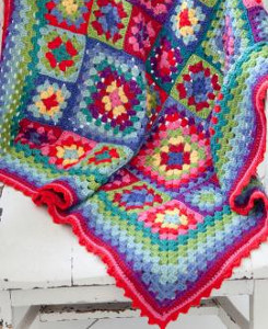 I really like this throw. It is so colourful and it looks simple to make. I love that there are different sized squares, and the granny square border really adds to it. This one will be going on my to do list. I think it would look great on the back of the couch.