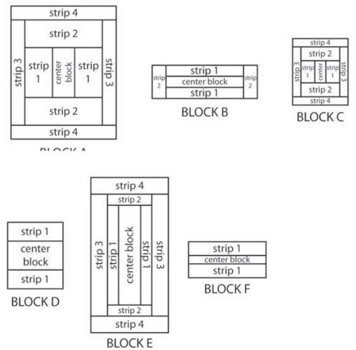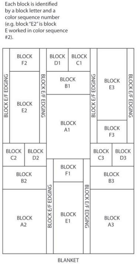 2. The blanket is constructed from a number of blocks and strips. Refer frequently to the assembly diagrams for placement of blocks and strips.