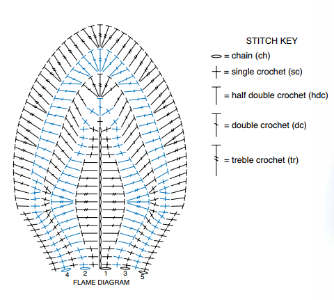 1st row: 1 sc in 2nd ch from hook. 1 sc in each of next 2 ch. 1 hdc in each of next 2 ch. 1 dc in each of next 2 ch. 1 tr in each of next 3 ch. 1 dc in each of next 2 ch. 1 hdc in each of next 2 ch. 1 sc in each of next 3 ch. 3 sc in last ch. Working across opposite side of foundation ch, 1 sc in each of next 3 ch. 1 hdc in each of next 2 ch. 1 dc in each of next 2 ch. 1 tr in each of next 3 ch. 1 dc in each of next 2 ch. 1 hdc in each of next 2 ch. 1 sc in each of last 3 ch. Turn