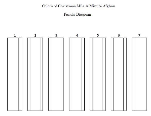 With right side facing and white working through top loops whip stitch panels together beginning in first dc and ending in last dc. See Panel Diagram for placement of panels.