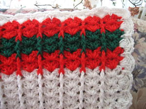 Rows 13 –78: Continue pattern of 2 rows red, 2 rows green, 2 rows red, 6 rows white, fasten off