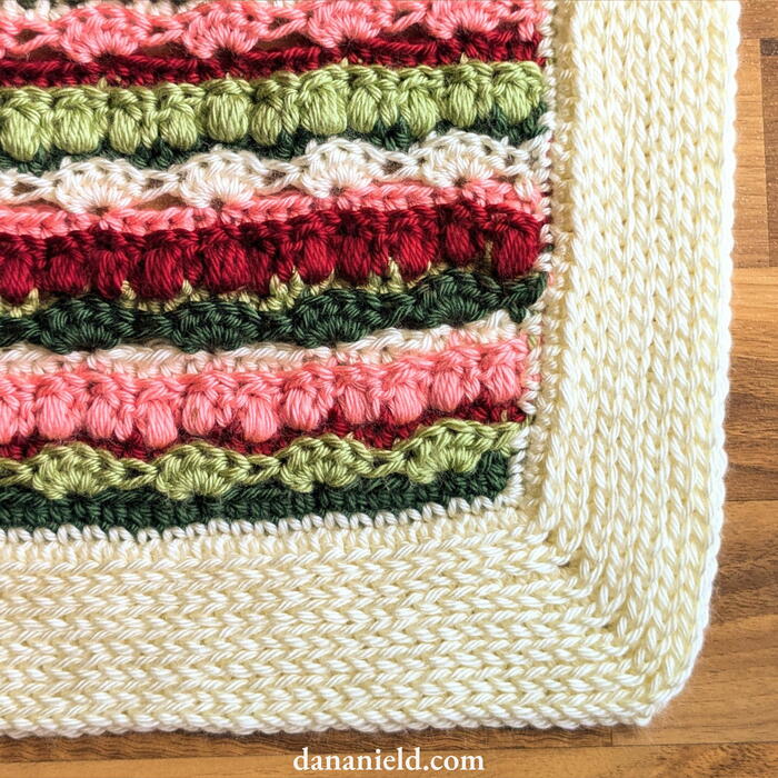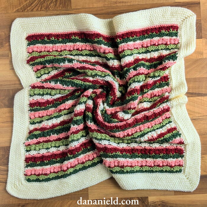 From the Designer: "Crochet a baby blanket for a little one with a due date around Christmas! This Christmas crochet baby blanket pattern is full of fun, textured stitches, and YES: you can easily memorize this pattern! This Christmas crochet baby blanket pattern is a four-row repeat, but don’t let that intimidate you if you’re used to simpler designs. Two of the four rows in the repeat are comprised entirely of half double crochets in the back loop only across. I called this baby blanket Holly Berry Seashore because the two remaining rows feature puff stitches that remind me of holly berries, and shell stitches which remind me of sea shells! The blanket is finished off with a camel stitch border for a cozy feel. The shell stitches are made from hdcs, and the puffs are, in a way, super hdcs. Camel stitch is hdc in the third loop… Thus, the entire blanket features variations on the half double crochet. I repeat, you can memorize this!! Easily! I hope you enjoy this pattern!"