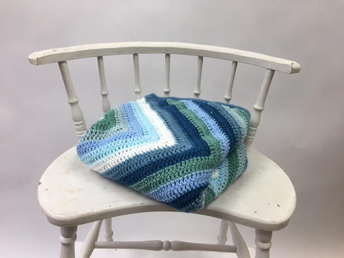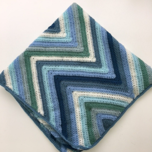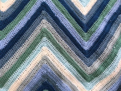 Repeat Row 2 until blanket reaches desired length when measured from bottom edge to tallest peak of chevron, changing color when necessary. Be sure to end with a RS row. -