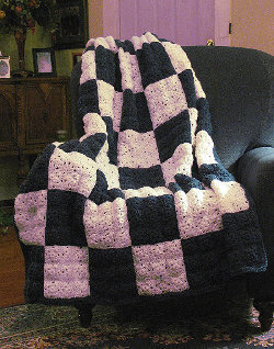 I love the look of this afghan. I would suggest adding a 3rd color square, in between the white and dark blue colors. When I originally saw the picture it looked like there was a light blue color in some places. The pattern is really simple to read, and Im guessing you could whip this up fairly quickly if you are in need of a quick gift.
