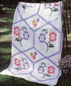 Combine your love of crochet with your talent for cross stitch with this Trellis Garden Afghan. The crochet afghan pattern is free, and the finished product is light and lovely.
