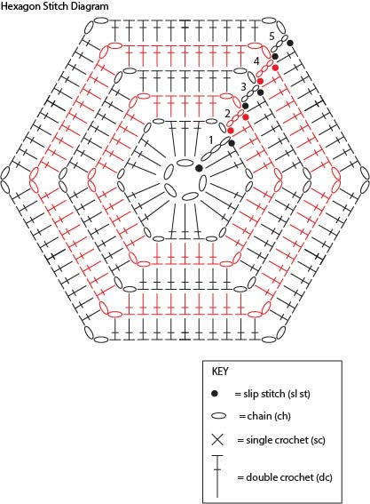 - Each Hexagon is worked in joined rnds with RS always facing.