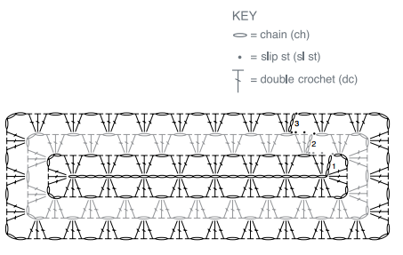 1st rnd: (RS). 2 dc in 3rd ch from hook. (Ch 1. Skip next 3 ch. 3 dc in next ch) 6 times. Ch 1. Skip next 3 ch. [(3 dc. Ch 3) twice. 3 dc] in last ch. Working along opposite side of foundation ch, (Ch 1. Skip next 3 ch. 3 dc in next ch) 6 times. Ch 1. Skip next 3 ch. (3 dc. Ch 3) twice in last ch. Join with sl st to top of ch 3.