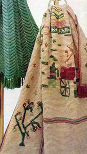 This is a combination piece if I have ever seen one. I have used the afghan stitch many years ago because I really wanted to cross stitch a design. I had just learned to cross stitch and thought I would be a champ at completing it. Needless to say, I finished the blanket but failed to complete the cross stitch on the pattern. This Chinese Screen is not my taste but I can appreciate the work.
