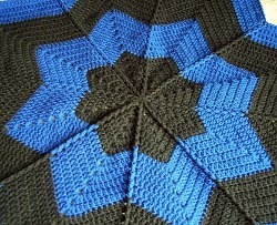 This is a really nice pattern. I like the raised lines between sections. It gives it a more three-dimensional appearance. The pattern is easy to follow, and adjusting it for size is simple. This would be a great throw for the back of the couch or a childs room. You could use a tougher yarn and make a nice rug with it too.