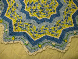 Take a trip to the countryside with the French Country Round Ripple. This round ripple crochet afghan looks like green meadows and cool ponds. Yellow crochet flowers make this afghan look like spring has sprung. Full of intricate details, this isn't the typical round ripple pattern but well worth the effort. This afghan would look beautiful in a summer home or on a nice rocking chair.