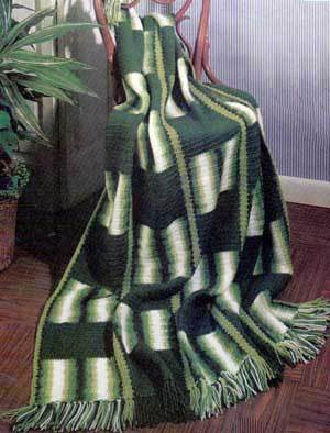The interrupted stripes of this Jungle Striped Afghan make for a uniquely patterned blanket. Use a combination of dark green, light green, and white yarn to preserve this striped afghan crochet pattern's eye-catching color scheme. Made with worsted weight yarn, this blanket will keep you cozy without making you sweat. The fringe around the edge is a fun accent on an already fabulous piece. Because of its simple color scheme and design, this afghan would make a great gift for your sweetheart.