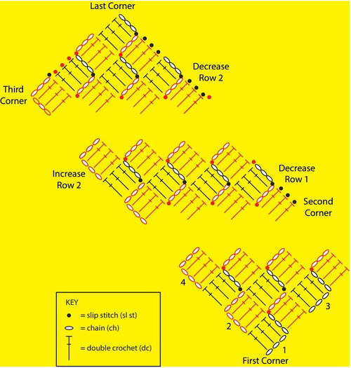 Note: When repeating stripe sequence begin with 6 rows of A. Continue in this manner increasing at beginning of every row until side edge measures 44" (48 blocks).