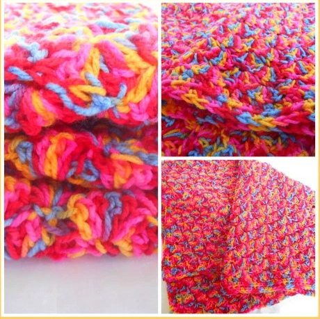 Such a pretty pattern! I can hardly believe it says "beginner". This is a wonderful color combo and it seems as though there are others that would work up just as nicely depending on your tastes and preferences! I was wondering if anyone has had any difficulties with handling 4 threads of yarn at once? I bet that makes this really warm and snuggly!