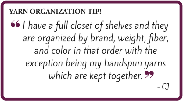- "I have a full closet of shelves and they are organized by brand, weight, fiber, and color in that order with the exception being my handspun yarns which are kept together." - CJ
