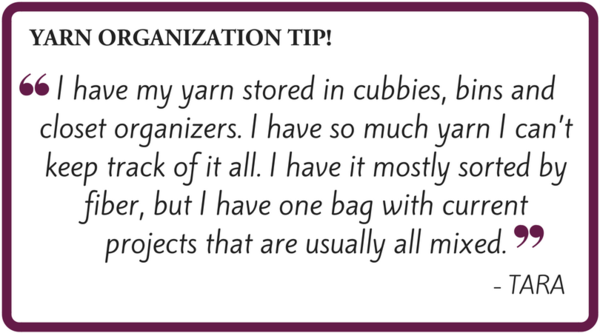 - "I have my yarn stored in cubbies, bins and closet organizers. I have so much yarn I can’t keep track of it all. I have it mostly sorted by fiber, but I have one bag with current projects that are usually all mixed." - Tara