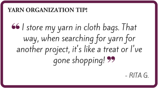 - "I store my yarn in cloth bags, that way when searching for yarn for another project, it’s like a treat or I’ve gone shopping!" - Rita G.