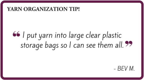 - "I put yarn into large clear plastic storage bags so I can see them all." - Bev M.