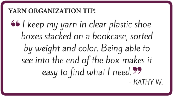 - "I keep my yarn in clear plastic shoe boxes stacked on a bookcase, sorted by weight and color. Being able to see into the end of the box makes it easy to find what I need." - Kathy W.