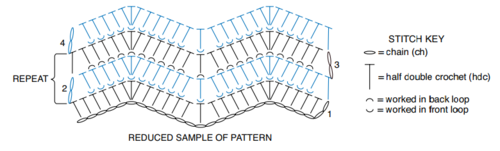 3rd row: With B, ch 2 (counts as hdc). Skip next hdc. 1 hdcbl in each of next 4 hdc. 3 hdcbl in next hdc. *1 hdcbl in each of next 5 hdc. Skip next hdc. 1 hdcbl in next hdc. Skip next hdc. 1 hdcbl in each of next 5 hdc. 3 hdcbl innext hdc. Rep from * to last 6 hdc. 1 hdcbl in each of next 4 hdc. Skip next hdc. 1 hdcbl in last hdc. Turn.