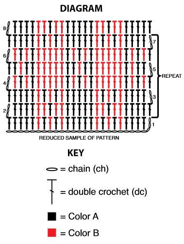 Note: When joining colors, work to last 2 loops on hook of first color. Draw new color through last 2 loops and proceed. Carry color when not in use loosely across top of previous row and work sts around it to avoid stranding.