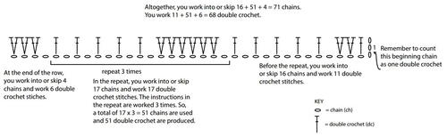 Row 3: Ch 3 (counts as first dc here and throughout), dc in first sc, 2 dc in next 2 sc, [skip next sc, dc in next sc] 5 times, *skip next sc, 2 dc in next 6 dc, [skip next sc, dc in next sc] 5 times; repeat from * to last 4 sc, skip next sc, 2 dc in last 3 sc, turn.