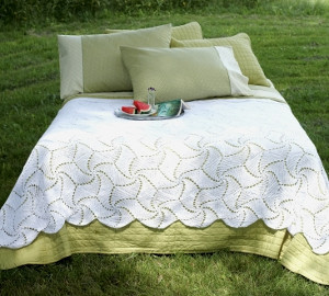 Very pretty and unique. I love the way the pinwheels interlock, making it so there really is no center starting point when looking at them. It is nice and large too, big enough to cover a full or queen sized bed properly. Matching shams, or accent pillows in a contrasting colour would look lovely with this.