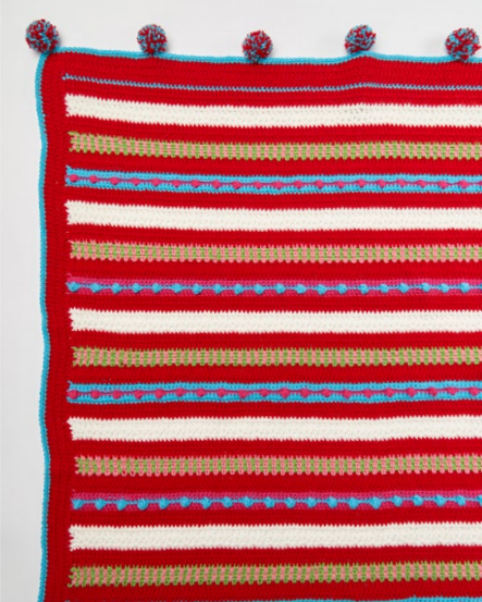 Make 14 pom pons with A and B held together. Sew 7 each, evenly spaced, to short edges of Throw.