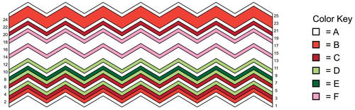 - RED HEART® With Love®: 3 skeins 1101 Eggshell A, 1 skein each 1909 Holly Berry B, 1914 Berry Red C, 1601 Lettuce D, 1621 Evergreen E, and 1704 Bubblegum F