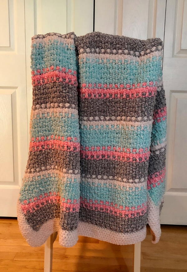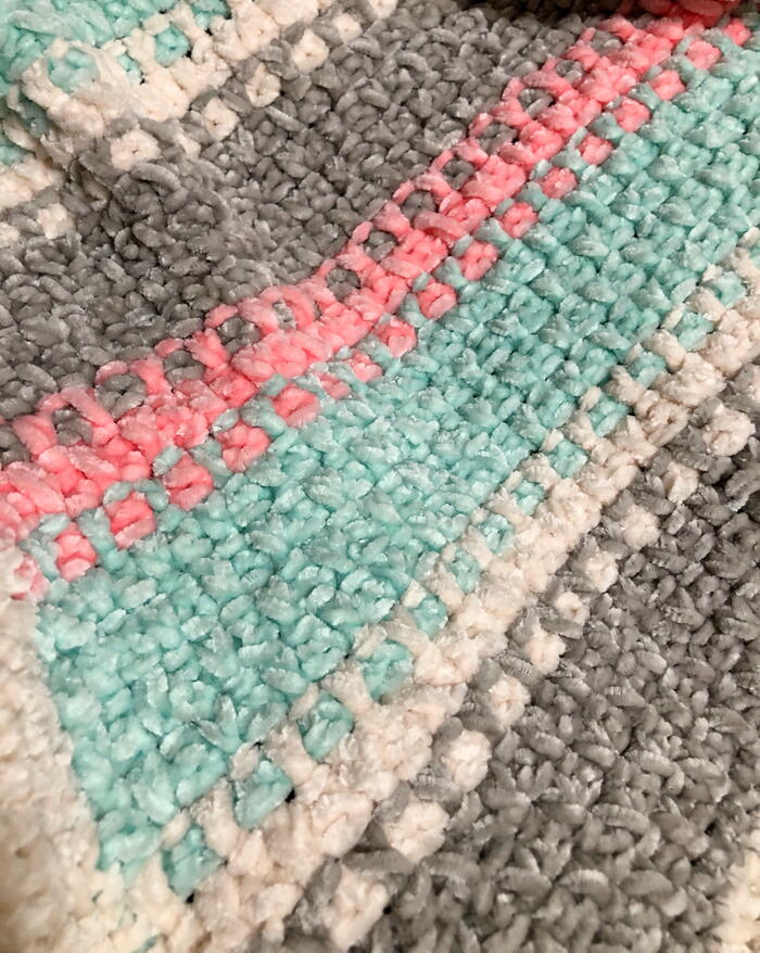 "This soft and sweet textured velvet crochet blanket feels like it should be used in an expensive hotel SPA. Use modern crochet stitches paired with Bernat Baby Velvet yarn to crochet this luxurious throw. Soft and Squishy Afghan The combination of front post double crochet and back post double crochet paired with this silky yarn create a soft and squishy Afghan. When my daughter ran her hands across this blanket, she snuggled her face against the yarn. She said the fluffy and soft blanket was the plushest feeling one yet. We think it is because of the added texture created by the crochet stitches and the fluffy yarn. Pair this bulky yarn with the right stitch and you have a winner. The pattern is a two-row repeat consisting of a row of single crochet, which ads a bit of stability to the entire project. The next row uses a special stitch pattern alternating the front post double crochet and back post double crochet stitches."