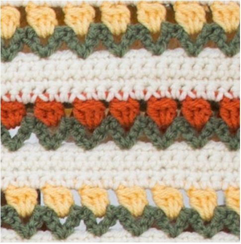 Row 3: With C, ch 3, skip first dc, * Cl in next ch-1 space, ch 2; repeat from * to last ch-1 space; Cl in last ch-1 space, dc in top of ch-3 changing to A; turn.