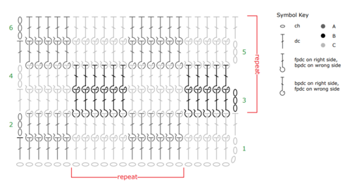 A, B, C = Color A, Color B, Color C; ch = chain; dc = double crochet; st(s) = stitch (es); * or ** = repeat whatever follows the * or ** as indicated.