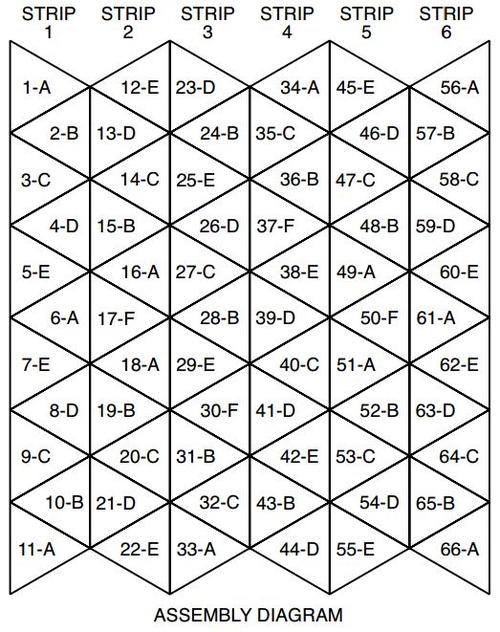 Make and join 65 more motifs same as First Triangle Motif, joining each to previous motif while completing last round as follows. Make and join motifs in numerical order following Assembly Diagram for color section and placement. Join motifs at ch-6, ch-4 and ch-2 spaces but not at ch-1 spaces.