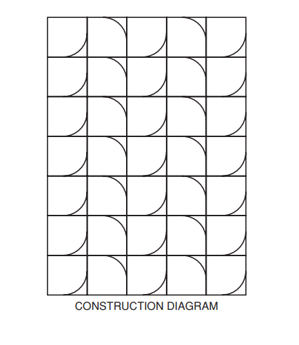 See Construction Diagram below. Join squares into 5 columns with 7 squares in each column. In columns 1, 3, and 5, fans should point down and to the right. In columns 2 and 4, fans should point up and to the right. Join on 1 or 2 sides as necessary while working Round 2 of border. To join ch-4 spaces on 1 side of square, continuing in pattern st, ch 2, drop loop, draw loop under to over through corresponding ch-4 space on adjacent square, ch 2 and continue in pattern st. When joining 2 sides of square where corner of square meets corner of 3 adjacent squares, ch 2, drop loop, draw loop under to over through corresponding corner ch-4 space on first adjacent square, ch 1, drop loop, skip corner ch-4 space on 2nd adjacent square, draw loop under to over through corresponding corner ch-4 space on 3rd adjacent square, ch 2 and continue in pattern st.