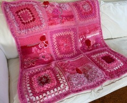 I made one of these in pink in February. Mine was 35 squares, 12 inches around (8 rounds of granny crochet in each square). I started it for a very good friend who had breast cancer. Unfortunately she passed away before I could give it to her. I have kept it instead of giving it to someone else. It is actually the first blanket I have made that I kept. Usually I am making them as gifts.