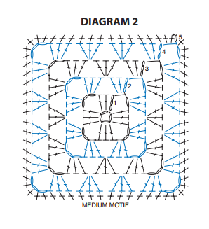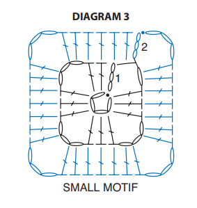 (Make 2 each with A, B, C, D, E, F, H, I, K, M and N. Make 1 with G, J and L – 25 total) See Diagram 3. Ch 4. Join with sl st to first ch to form a ring.