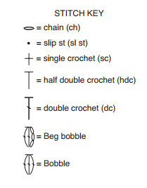 Beg bobble = Ch 3. (Yoh and draw up a loop. Yoh and draw through 2 loops on hook) twice in indicated stitch. Yoh and draw through all loops on hook.