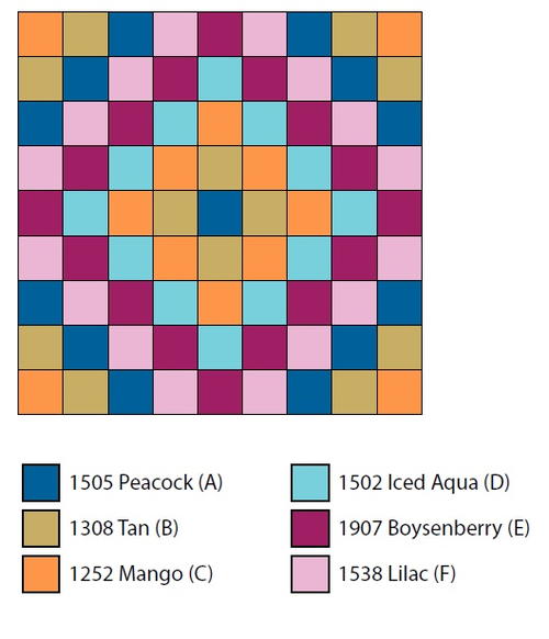 - RED HEART® With Love®: 2 skeins each of 1505 Peacock A, 1308 Tan B, 1252 Mango C, 1502 Iced Aqua D, 1907 Boysenberry E, and 1538 Lilac F
