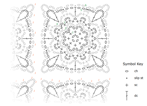A, B, C = Color A, Color B, Color C etc; ch = chain; dc = double crochet; sc = single crochet; st(s) = stitch(es); [ ] = work directions in brackets the number of times specified; * or ** = repeat whatever follows the * or ** as indicated.