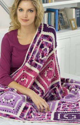 In this Passionate About Purple Throw, I just got the idea that I can use a multicolored yarn to combine with the other solid colored squares. Fantastic. I have in my yarn stash multicolored yarn I just have to think of a beautiful color combo to make something like this. Can't wait.