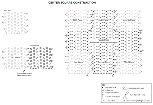 ch-2-join (join ch-2 spaces as you go) = Ch 1, drop loop from hook, insert hook from right side to wrong side through corresponding ch-2 space in neighboring Square, return dropped loop to hook, ch 1.