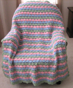 Rows of pink, green, and blue seashells make up this lovely crochet afghan. The She Sells Seashells Afghan is an easy 4-row pattern featuring the shell stitch. If you are crazy for Shells, this free pattern is for you! This crocheted afghan would look great in a girl's room.