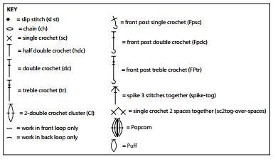 -             spike-tog (spike 3 stitches together) = Insert hook in next stitch and draw up a loop (2 loops on hook – first leg made), yarn over, working over the top of the next ch-1 space, insert hook in space between (2 dc, ch 3, 2 dc) groups 2 rounds below, yarn over and draw through 2 loops on hook (3 loops on hook – center leg made), insert hook in next stitch and draw up a loop (3rd leg made), yarn over and draw through all 4 loops on hook.