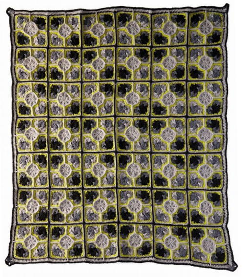 Wow! This is a piece of art. I can hardly believe that this is made from granny squares. The colors to me are a little off but I guess it goes along with the nouveau chic idea. This is what I would call a conversation starter.