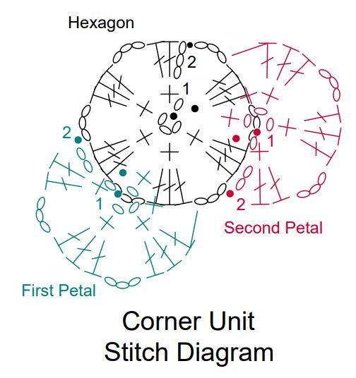 Note: Corner Unit is made from a corner hexagon and 2 petals joined together.