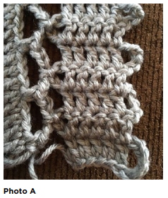 Row 1 (right side): Ch 10, dc in the 6th ch from the hook (beginning skipped ch do not count as a st) and in each remaining ch, ch 2; with right side of either short side of edging base facing, join with slip st in first ch-5 space, turn— 5 dc. (See Photo A)
